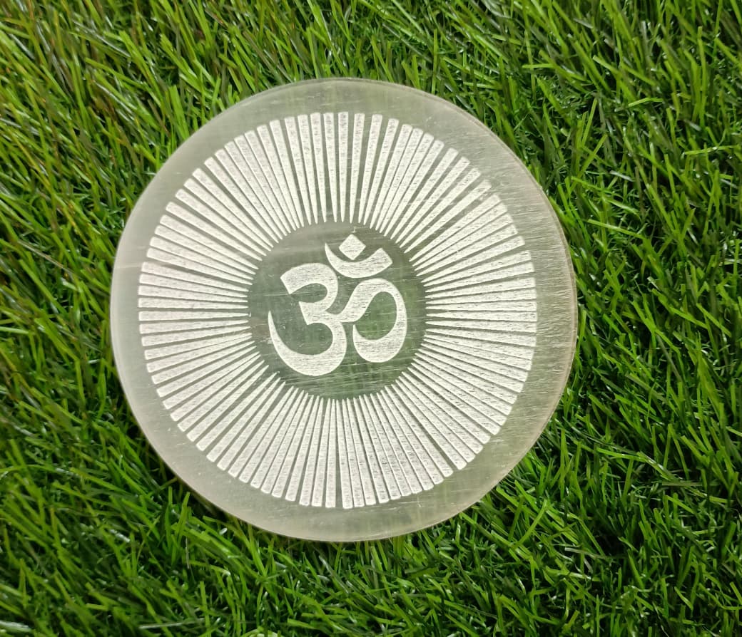 Om Symbol Engraved Selenite Plate - [4 Inches]