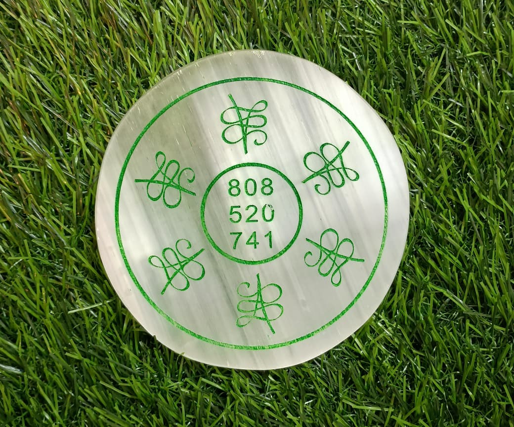 Our 4-Inch Selenite Crystal Charging Plate, featuring an intricate Zibu Symbol engraving, infuses any space...